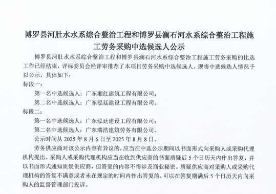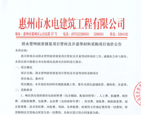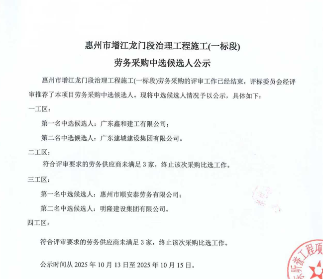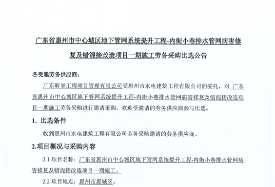 廣東省惠州市中心城區地下管網系統提升工程-內街小巷排水管網病害修復及錯混接改造項目一期施工勞務采購(第二次)中選候選人公示……
